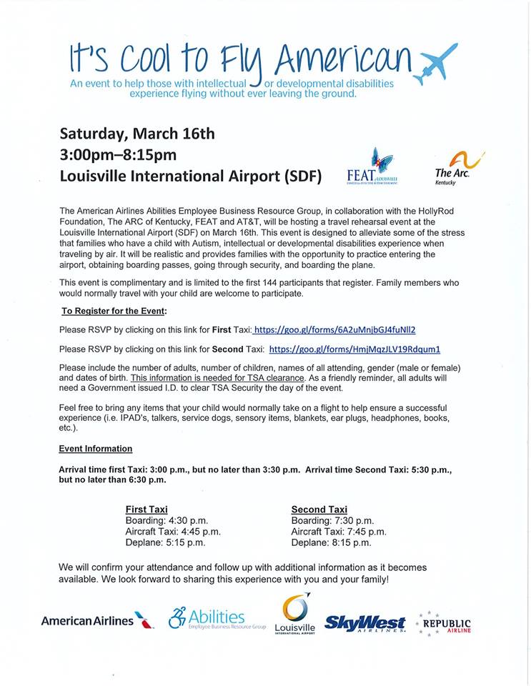 Here is the registration information for the March 16 event. Sorry the links were not working properly. Please register through American Airlines. Volunteers will need to register directly through The Arc of Kentucky or FEAT. Please contact Sherri at The Arc or Deborah at FEAT.